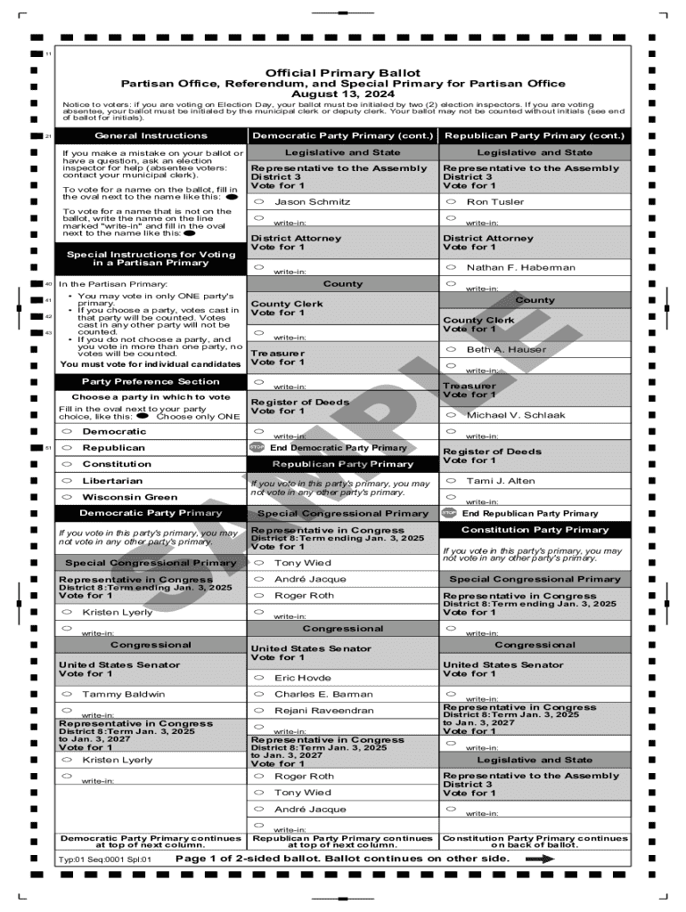 11Official Primary BallotPartisan Office, Referendum, and Special Primary for Partisan Office August 13, 2024, Notice to voters: if you are voting on Election Day, your ballot must be initialed by