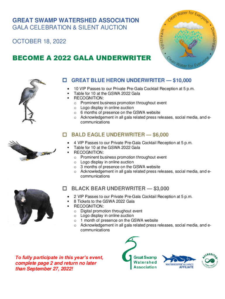 GREAT SWAMP WATERSHED ASSOCIATION GALA CELEBRATION & SILENT AUCTION OCTOBER 18, 2022BECOME A 2022 GALA UNDERWRITER GREAT BLUE HERON UNDERWRITER $10,000 10 VIP Passes to our Private PreGala Cocktail