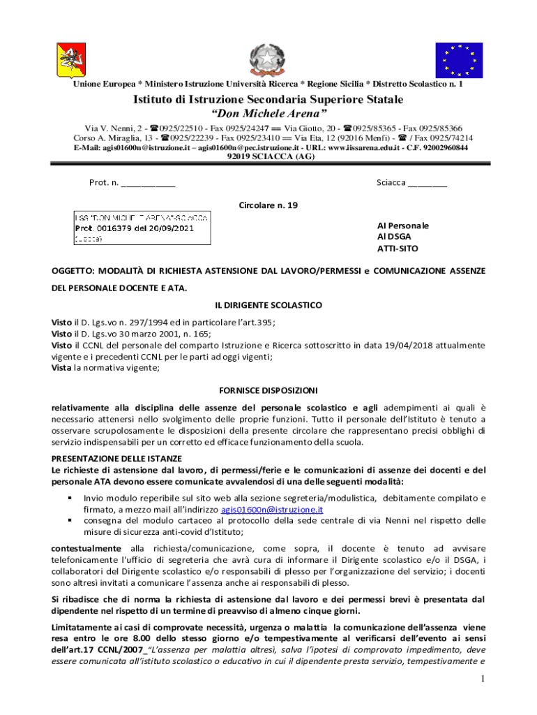Unione Europea * Ministero Istruzione Universit Ricerca * Regione Sicilia * Distretto Scolastico n. 1Istituto di Istruzione Secondaria Superiore Statale Don Michele Arena Via V. Nenni, 2 0925/22510
