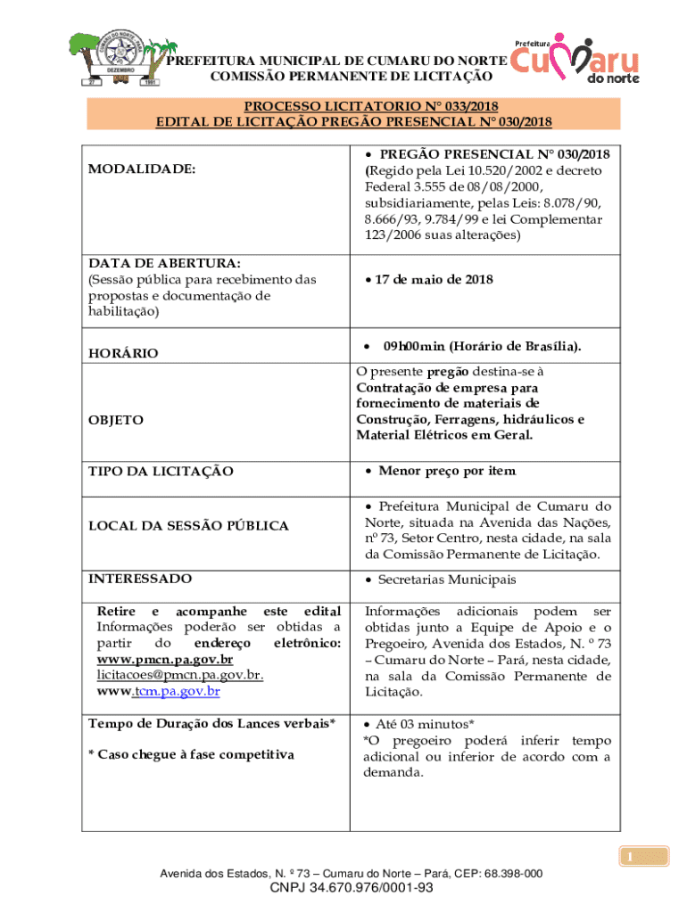 PREFECTURE MUNICIPAL DE CUM ARU DO NORTH COMICS PERMANENT DE LICIT AO PROCESS LICITATORIO N 033/2018 EDIT AL DE LICIT AO PRESO PRESENCE N 030/2018 PRESO PRESENCE N 030/2018 (Region plea Lei 10.520/2002