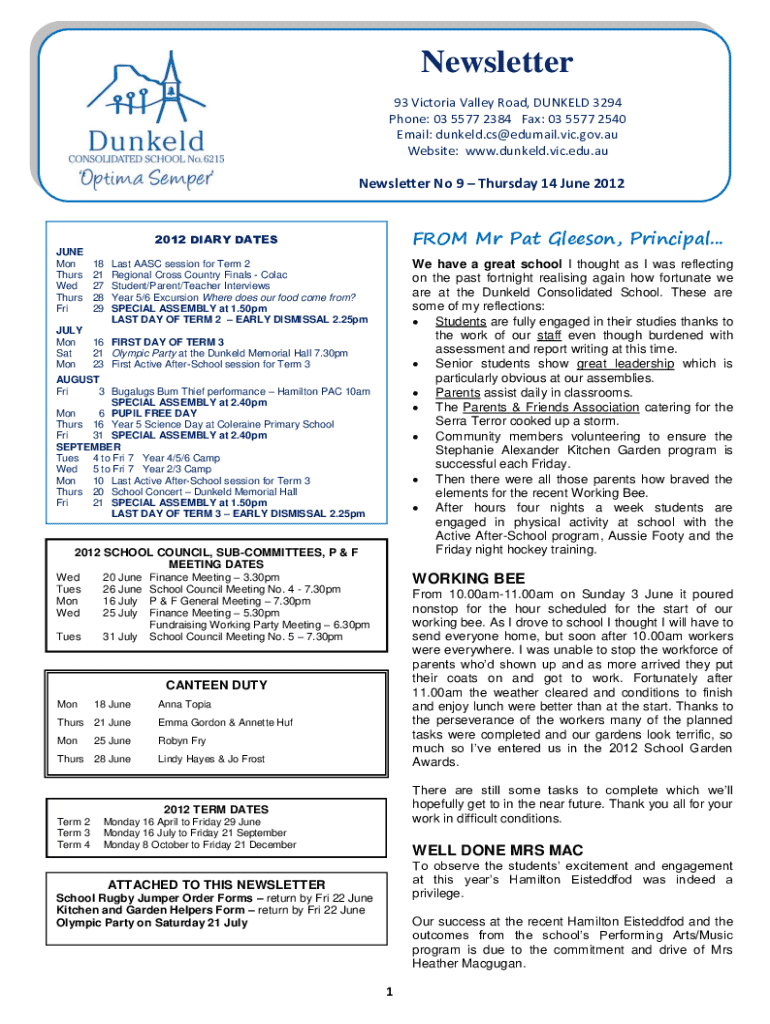 Newsletter 93 Victoria Valley Road, DUNKELD 3294 Phone: 03 5577 2384 Fax: 03 5577 2540 Email: dunkeld.cs@edumail.vic.gov.au Website: www.dunkeld.vic.edu.auNewsletter No 9 Thursday 14 June 2012FROM Mr Pat Gleeson, Principal...2012 DIARY DATES JUNE Mon Thurs Wed Thurs Fri18 21 27 28 29We have a great school I thought as I was reflecting on the past fortnight realising again how fortunate we are at the Dunkeld Consolidated School. These are some of my reflections: Students are fully
