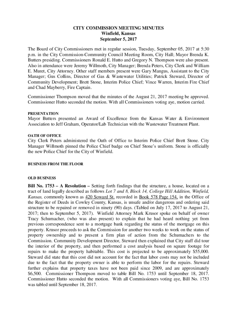 CITY COMMISSION MEETING MINUTES Winfield, Kansas September 5, 2017 The Board of City Commissioners met in regular session, Tuesday, September 05, 2017 at 5:30 p.m. in the City CommissionCommunity