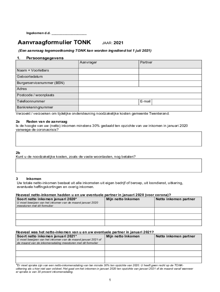 Ingekomen d.d. ___Aanvraagformulier TONKJAAR: 2021(Been aanvraag tegemoetkoming TOOK Kan wooden ingredient tot 1 July 2021)1. PersoonsgegevensAanvragerPartnerNaam + Newsletters