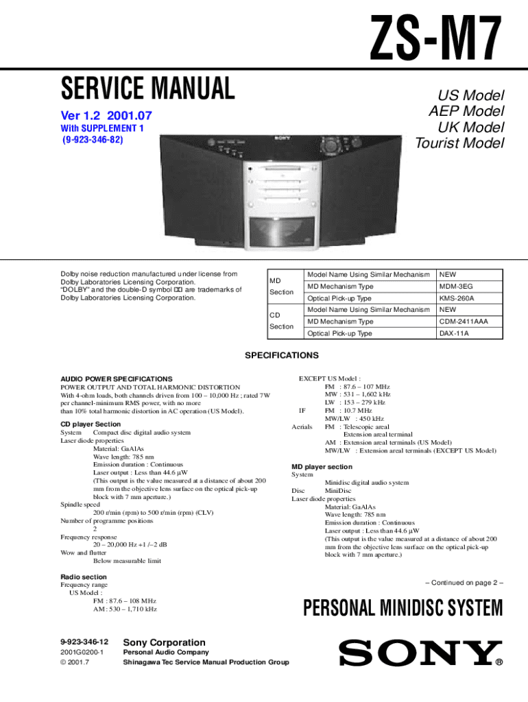 ZSM7 SERVICE MANUALUS Model AEP Model UK Model Tourist ModelVer 1.2 2001.07 With SUPPLEMENT 1 (992334682)Dolby noise reduction manufactured under license from Dolby Laboratories Licensing Corporation. DOLBY and the doubleD symbol a are trademarks of Dolby Laboratories Licensing Corporation.MD SectionCD SectionModel Name Using Similar MechanismNEWMD Mechanism TypeMDM3EGOptical Pickup TypeKMS260AModel Name Using Similar MechanismNEWMD Mechanism TypeCDM2411AAAOptical
