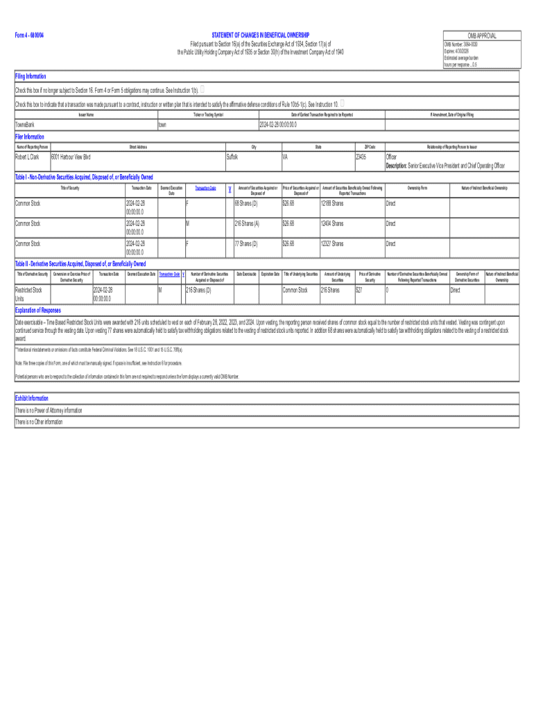 This document reports changes in beneficial ownership for Robert L Clark, an officer at TowneBank, detailing stock transactions and compliance with SEC regulations.