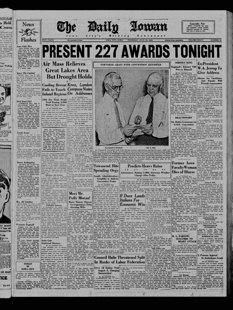 : HoldULY 16/1988. ...... \'to_ _ _ ..., _ _ _ ... .;.0..\"\" _News:aucusGenerally Fair IOWA OeD.e rall, faIr toda, and tomo,\"\"\", except POIl8Ib1, sca&teredeut; DOCd \'11to lh. 10.1 con ventlon, Id s Satu \"day, \'111 J ohnoon COunty VIT at 7 :30 p. m. h... meeting Is to atea one] to dis. A. t 10\"IIey Robert y Edwin B . IVII. E\' Igh tit Judicial \"\",1 11 preside. 1. h ree r epu bllcan u.t the state coo. a.ncleH are on th, t.wsnn In \" \' .l egat s\"orParking:nlowFlashes IOWA FALLS,