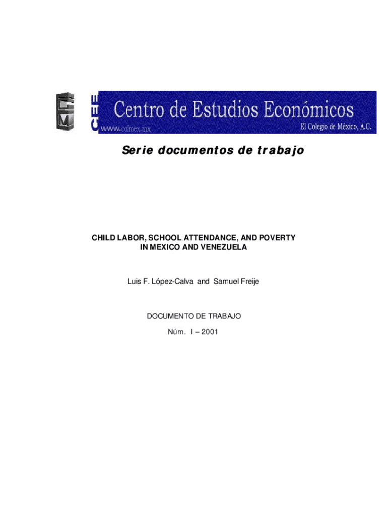 Serie documentos de trabajoCHILD LABOR, SCHOOL ATTENDANCE, AND POVERTY IN MEXICO AND VENEZUELALuis F. LpezCalva and Samuel FreijeDOCUMENTO DE TRABAJO Nm. I 2001CHILD LABOR, SCHOOL ATTENDANCE, AND POVERTY IN MEXICO AND VENEZUELA*Samuel Freije Cornell University sf27@cornell.edu and Luis F. LopezCalva El Colegio de Mxico and Universidad de las AmericasPuebla lflopez@colmex.mx Abstract This paper uses cross sectional and longitudinal data for Mexico and Venezuela from 1994 to 1998