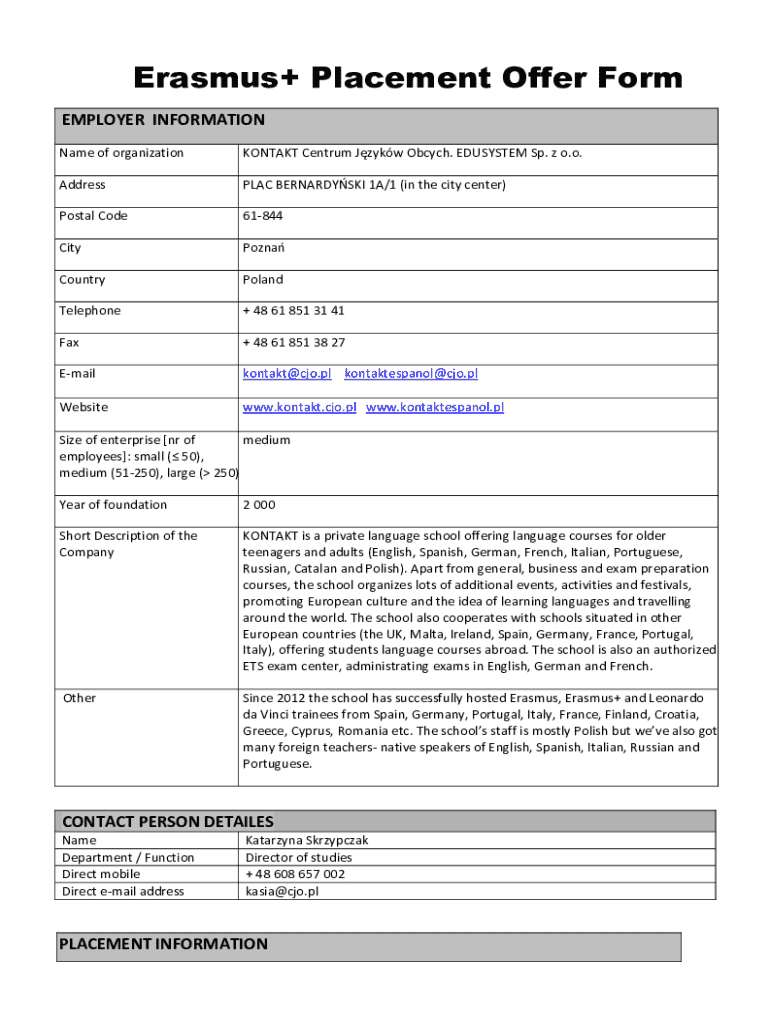 Get the free Erasmus+ Placement Offer Form