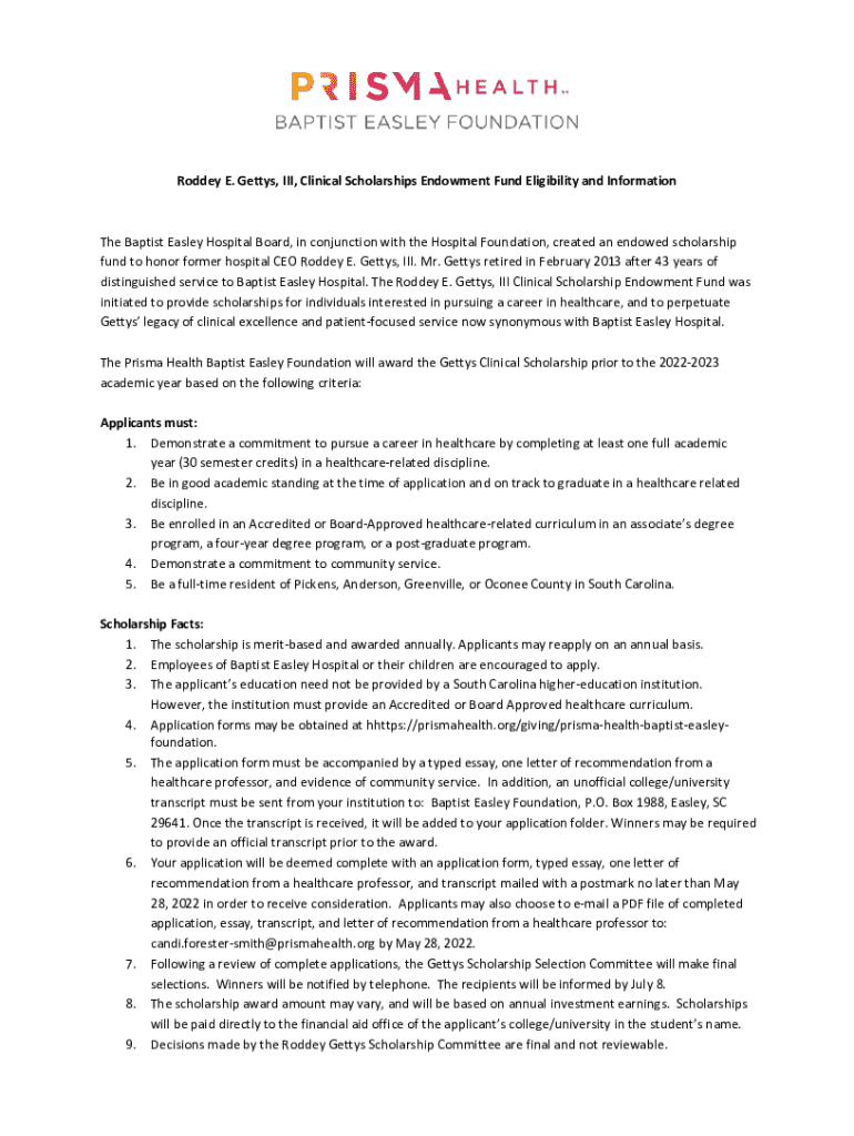 Get the free Roddey E. Gettys Iii Clinical Scholarships Endowment Fund