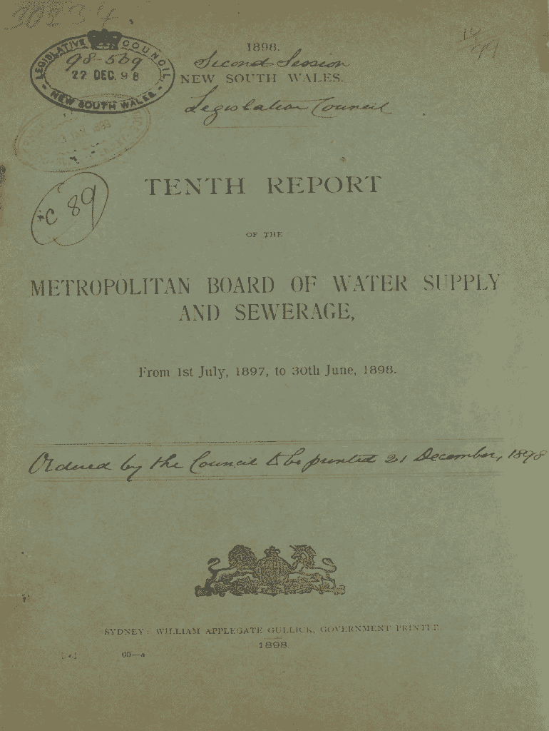 1898.NEW SOUTH W.LES. .I \' .%:\' 5i TENTH REPORT OF theMETROPOLITAN BOARD OF WATER SLl\'PLY AND SEWERAGE, From Tst July, 1897, to 30tli June, 1898.rI tSYDNEY: WILLIAM APPLEGATE (iULLlCK, GOVERNMENT PRINlI.n1898. 00a189B.NEW SOUTH WALESTENTH REPORT OF THEMETROPOLITAN BOARD OF WATER SUPPLY AND SEWERAGE, From 1st July, 1897, to 30th June, 1898SYDNEY ; WILLIAM APPLEGATE GULLICK. GOVERNMENT PRINTER.1898. 69aCONTENTS. BOARD3 REPORT Watbb..904444494