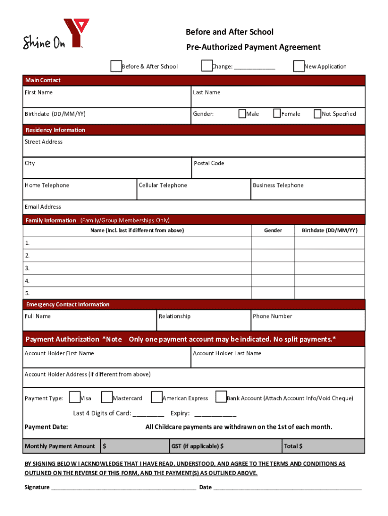 This Pre-Authorized Payment Agreement outlines payment terms for Before and After School services, detailing fees, terms, and conditions to ensure compliance.