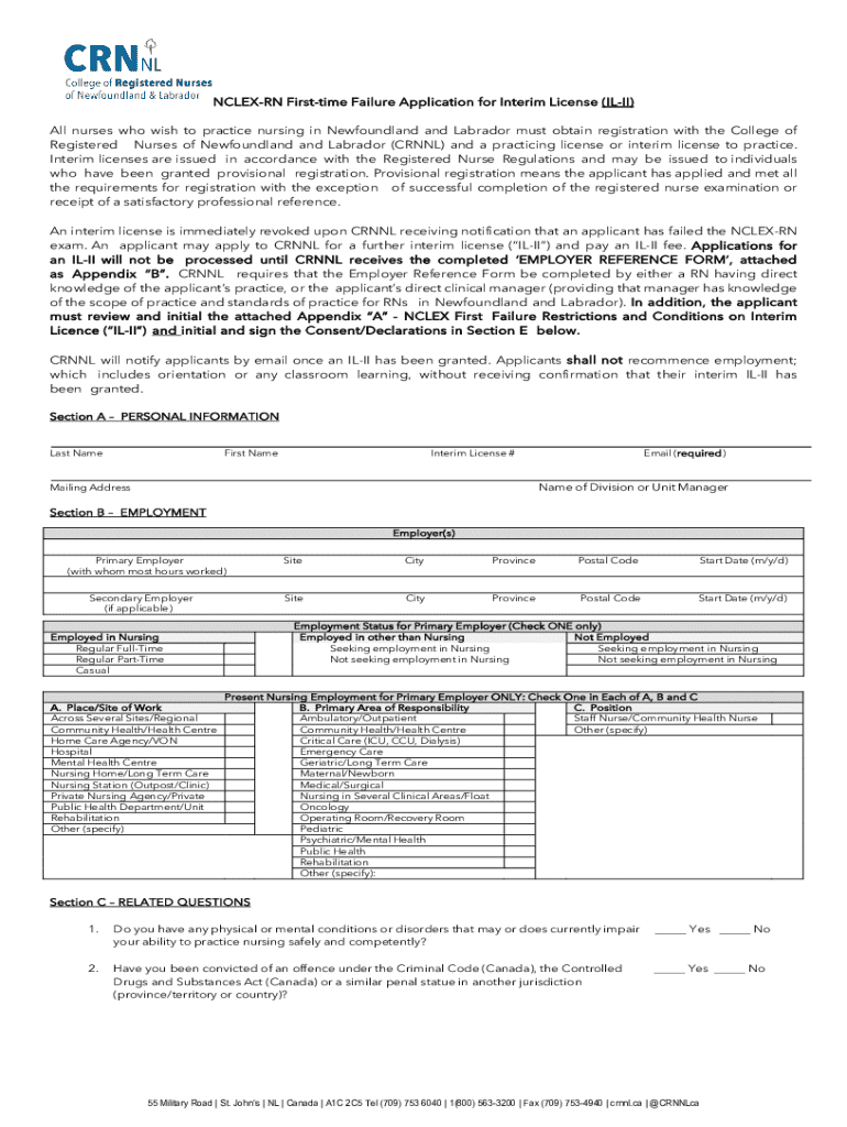 This application is for nurses in Newfoundland and Labrador seeking an interim license after failing the NCLEX-RN exam, outlining the necessary conditions and documentation.