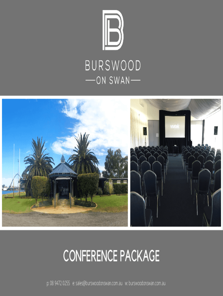 CONFERENCE PACKAGE p: 08 9472 0255 e: sales@burswoodonswan.com.au w: burswoodonswan.com.thank you for taking the time to inquire about conferences at Burs wood on Swan. We offer a unique setting for