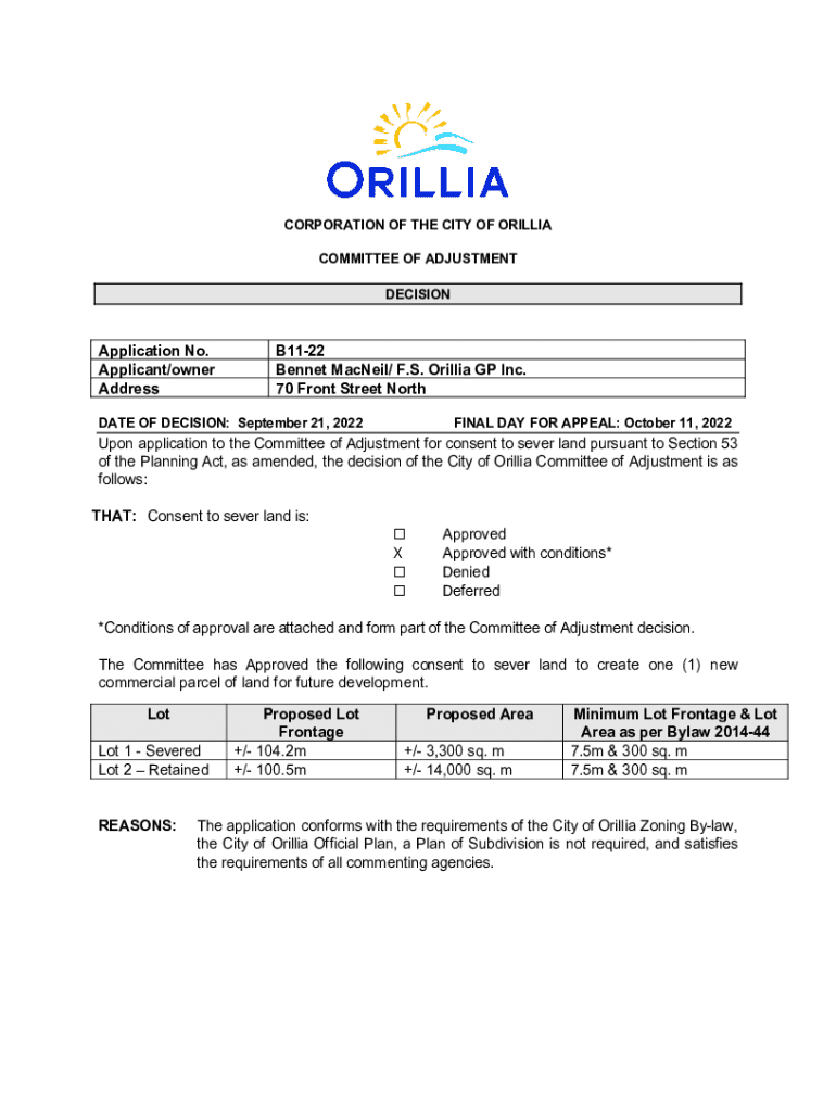 CORPORATION OF THE CITY OF ORILLIA COMMITTEE OF ADJUSTMENT DECISIONApplication No. Applicant/owner AddressB1122 Bennet MacNeil/ F.S. Orillia GP Inc. 70 Front Street NorthDATE OF DECISION: September