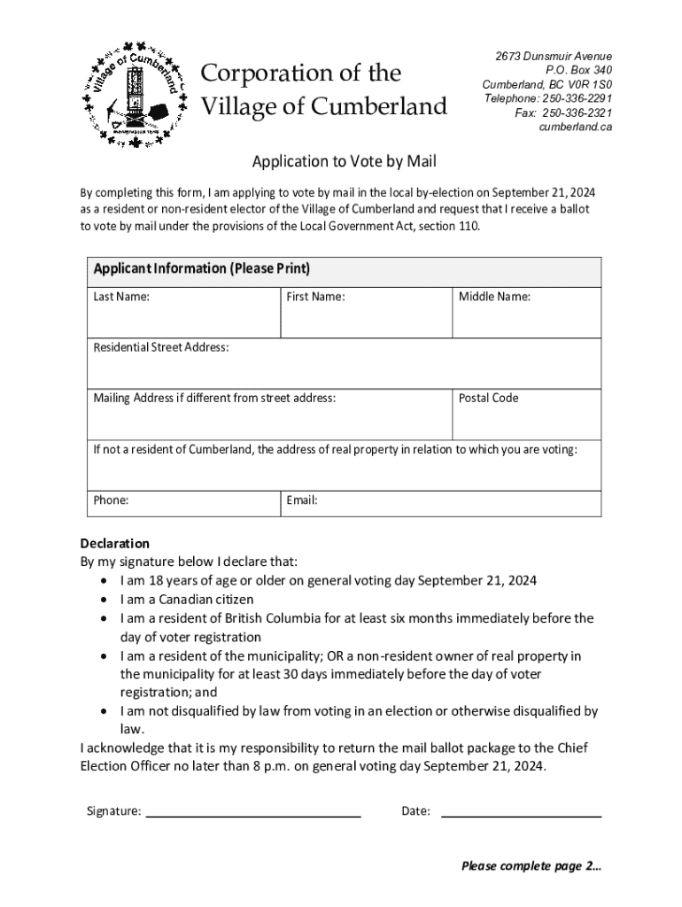 Corporation of the Village of Cumberland2673 Langmuir Avenue P.O. Box 340 Cumberland, BC V0R 1S0 Telephone: 2503362291 Fax: 2503362321 Cumberland.application to Vote by Mail By completing this form,