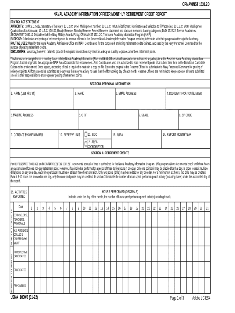 Get the free NAVAL ACADEMY INFORMATION OFFICER MONTHLY RETIREMENT CREDIT REPORT. USNA 4600/10