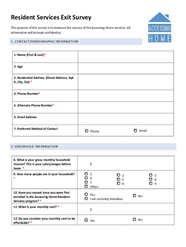 Resident Services Exit Survey The purpose of this survey is to measure the success of the Accessing Home services. All information will be kept confidential. 1. CONTACT/DEMOGRAPHIC INFORMATION1. Name