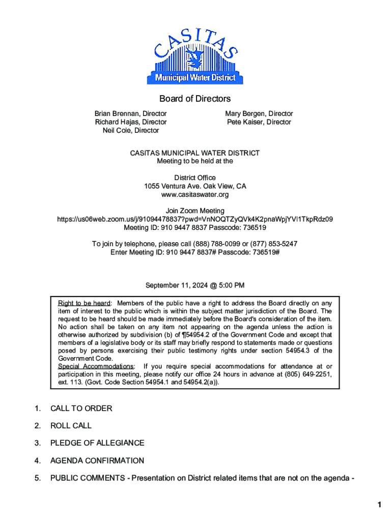 Board of Directors Brian Brennan, Director Richard Hajas, Director Neil Cole, DirectorMary Bergen, Director Pete Kaiser, DirectorCASITAS MUNICIPAL WATER DISTRICT Meeting to be held at the District
