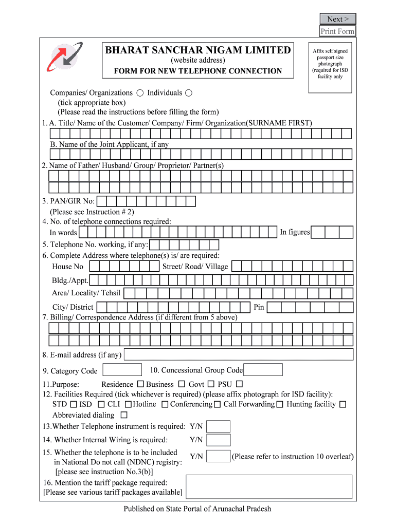 Next Print Form BHARAT ANCHOR NI GAM LIMITED (website address) FORM FOR NEW TELEPHONE CONNECTION Affix self-signed passport size photograph (required for ISD facility only Companies/ Organizations