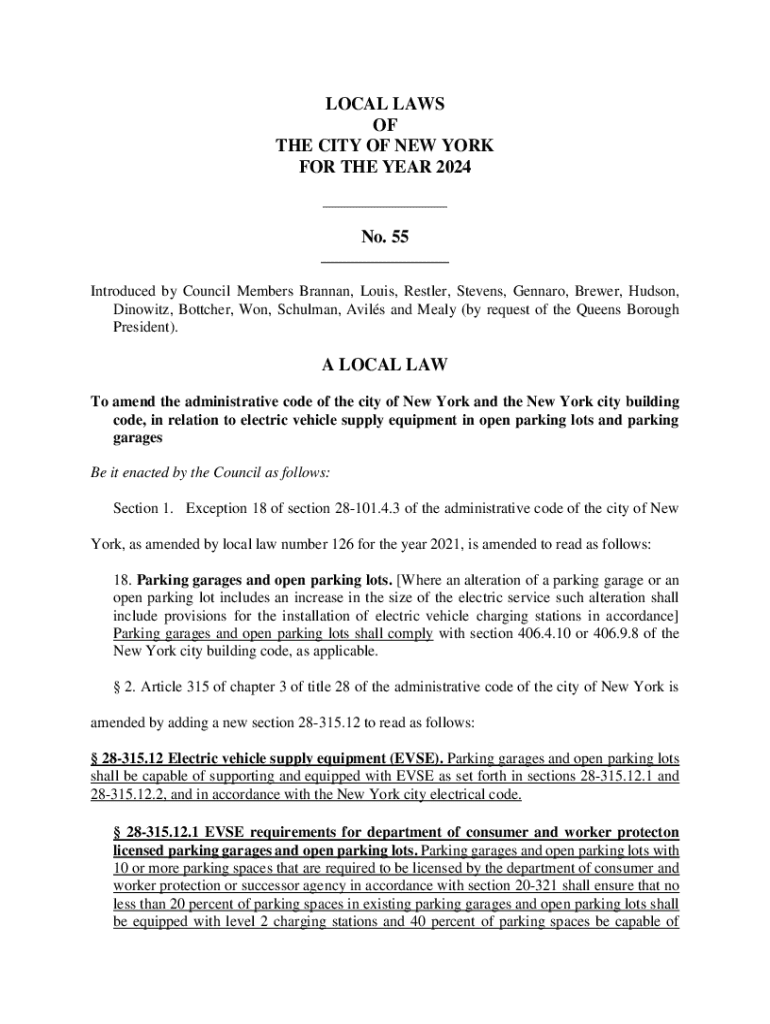 This document outlines NYC\'s 2024 local law requiring electric vehicle supply equipment standards for parking garages and open lots, enhancing EV infrastructure.