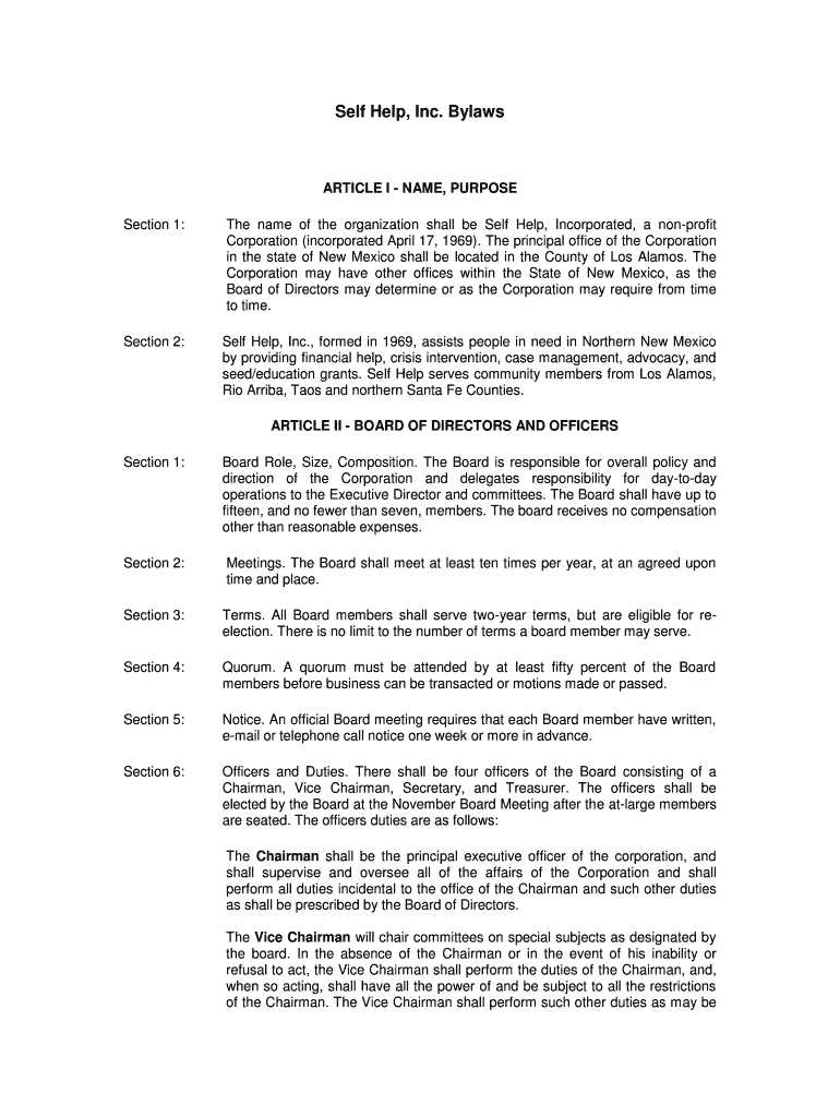 Self Help, Inc. Bylaws ARTICLE I NAME, PURPOSE Section 1: The name of the organization shall be Self Help, Incorporated, a nonprofit Corporation (incorporated April 17, 1969). The principal office