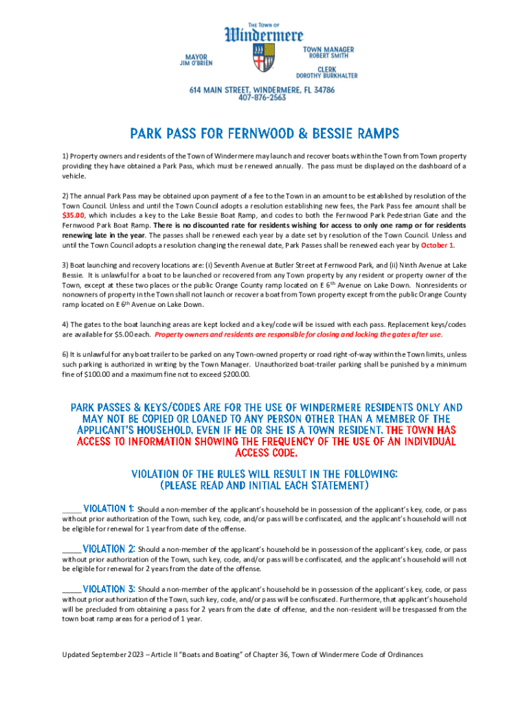 1) Property owners and residents of the Town of Windermere may launch and recover boats within the Town from Town property providing they have obtained a Park Pass, which must be renewed annually.
