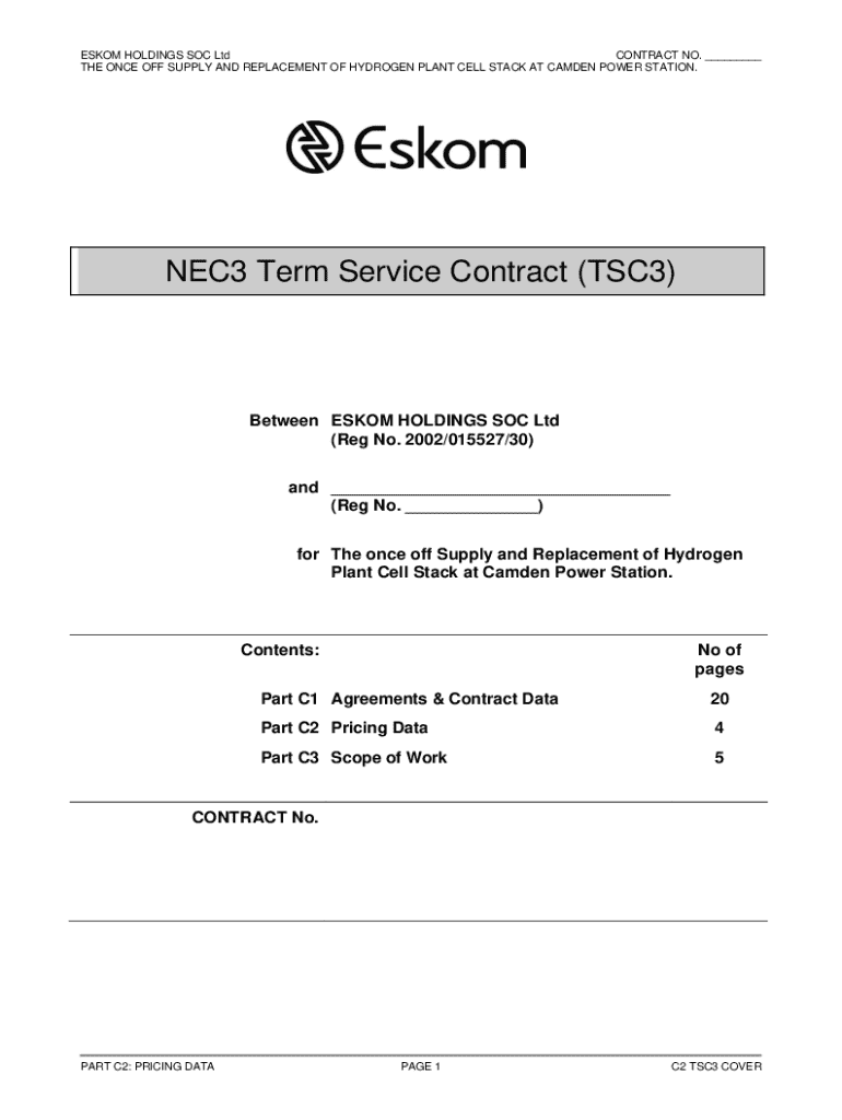 ESKOM HOLDINGS SOC Ltd CONTRACT NO. ___ THE ONCE OFF SUPPLY AND REPLACEMENT OF HYDROGEN PLANT CELL STACK AT CAMDEN POWER STATION.NEC3 Term Service Contract (TSC3)Between ESKOM HOLDINGS SOC Ltd (Reg