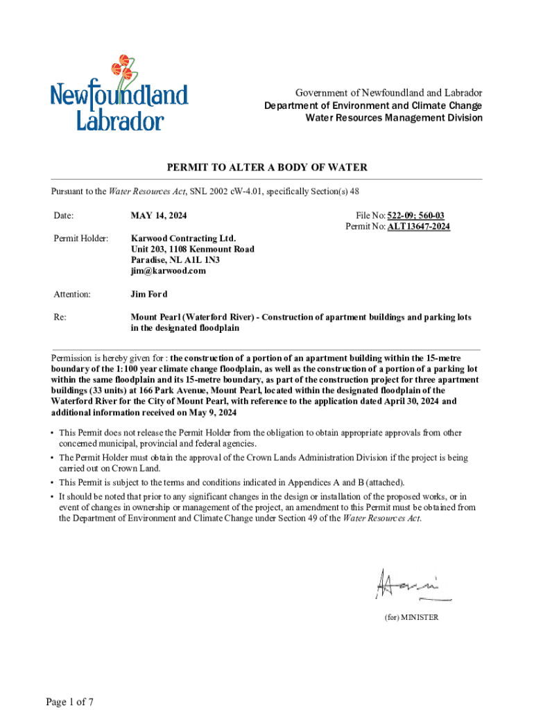 Government of Newfoundland and Labrador Department of Environment and Climate Change Water Resources Management DivisionPERMIT TO ALTER A BODY OF WATER Pursuant to the Water Resources Act, SNL 2002