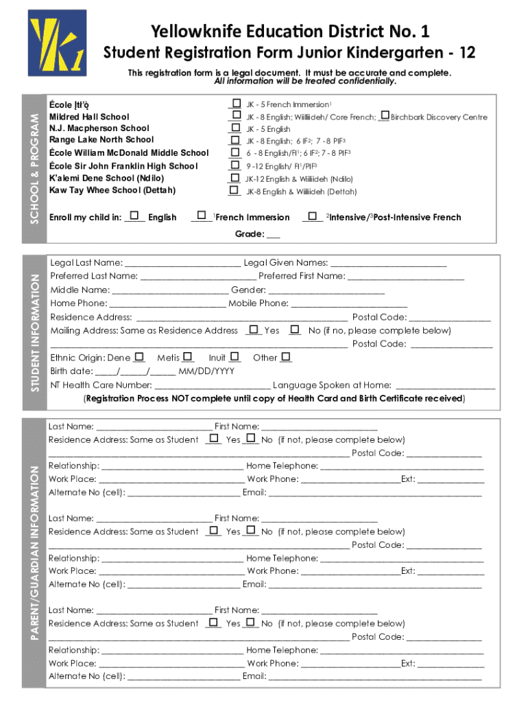 Complete your child\'s registration for Junior Kindergarten to Grade 12 in Yellowknife Education District No. 1. Ensure all information is accurate and confidential.