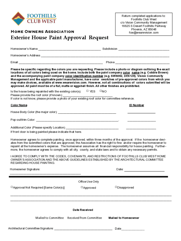 Return completed applications to: Foothills Club West c/o Vision Community Management 16625 S Desert Foothills Parkway Phoenix, AZ 85048 fcw@wearevision.comHome Owners AssociationExterior House Paint