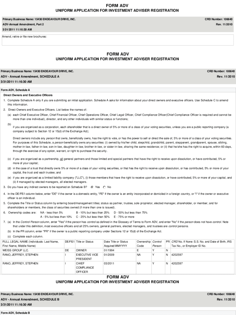 FORM ADV UNIFORM APPLICATION FOR INVESTMENT ADVISER REGISTRATION Primary Business Name: 15430 ENDEAVOUR DRIVE, INC.CRD Number: 106640ADVAnnual Amendment, Part 2Rev. 11/20103/31/2011 11:16:30 AM Amend,