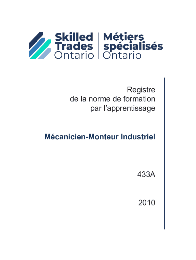Registre de la norme de formation par lapprentissage McanicienMonteur Industriel433A 2010Norme de formation par lapprentissageLa norme de formation par lapprentissage (ou, ciaprs, le registre ) est