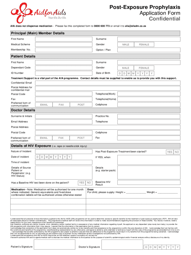 PostExposure Prophylaxis Application Form Confidential AFA does not dispense medication Please fax this completed form to 0800 600 773 or email it to afa@afadm.co.zaPrincipal (Main) Member Details