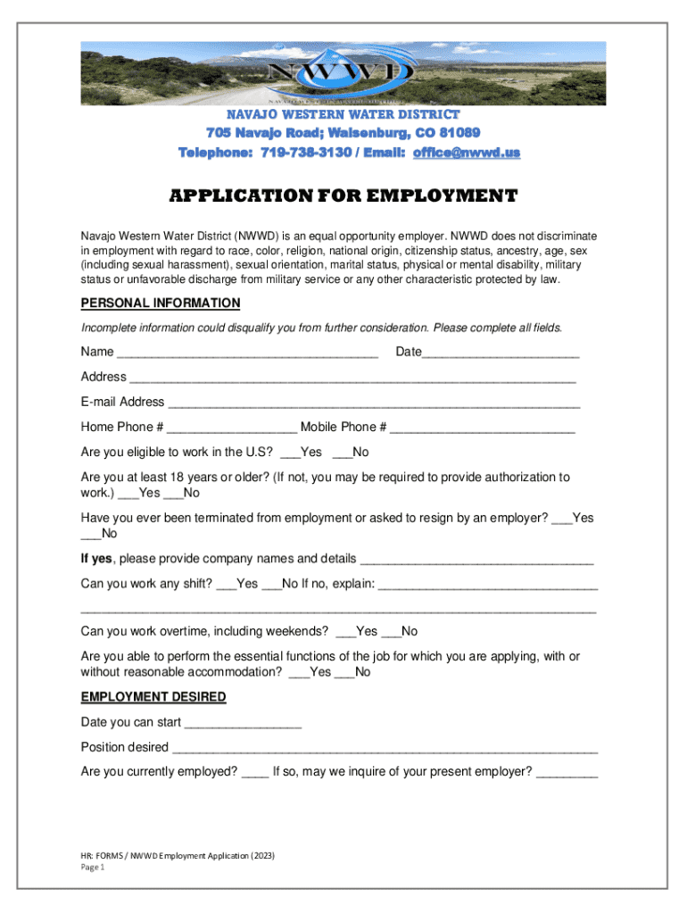NAVAJO WESTERN WATER DISTRICT 705 Navajo Road; Walsenburg, CO 81089 Telephone: 7197383130 / Email: office@nwwd.usAPPLICATION FOR EMPLOYMENT Navajo Western Water District (NWWD) is an equal opportunity
