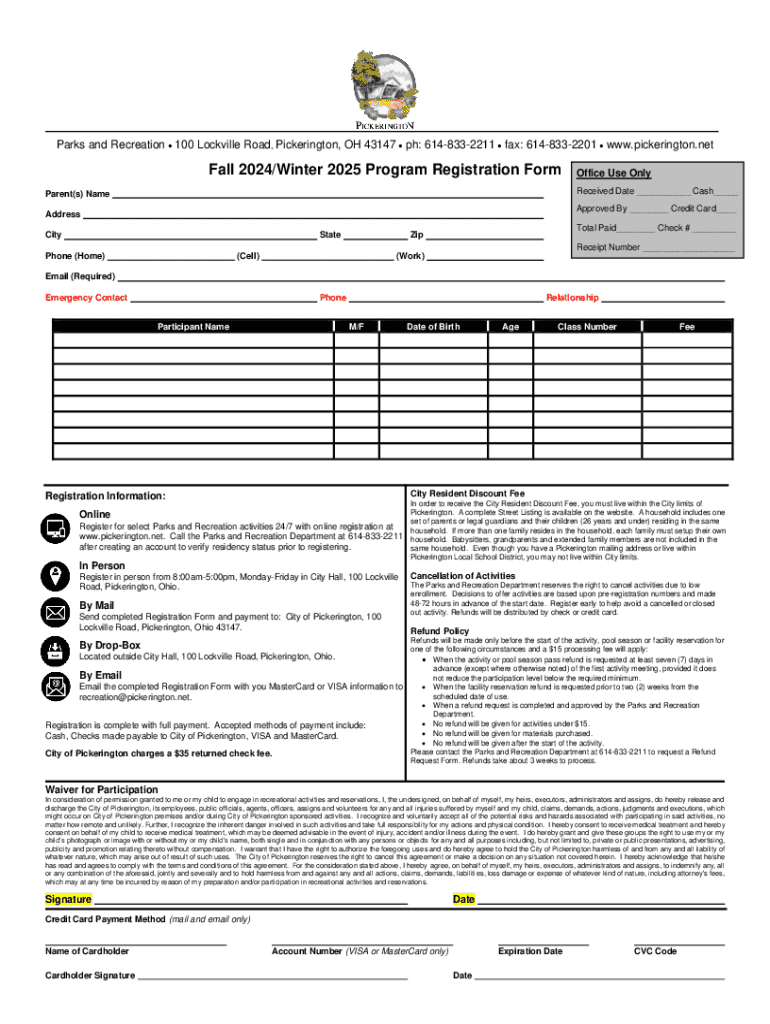 Register for Fall 2024/Winter 2025 Parks and Recreation activities in Pickering ton, OH. Learn about fees, cancellation policies, and registration options.