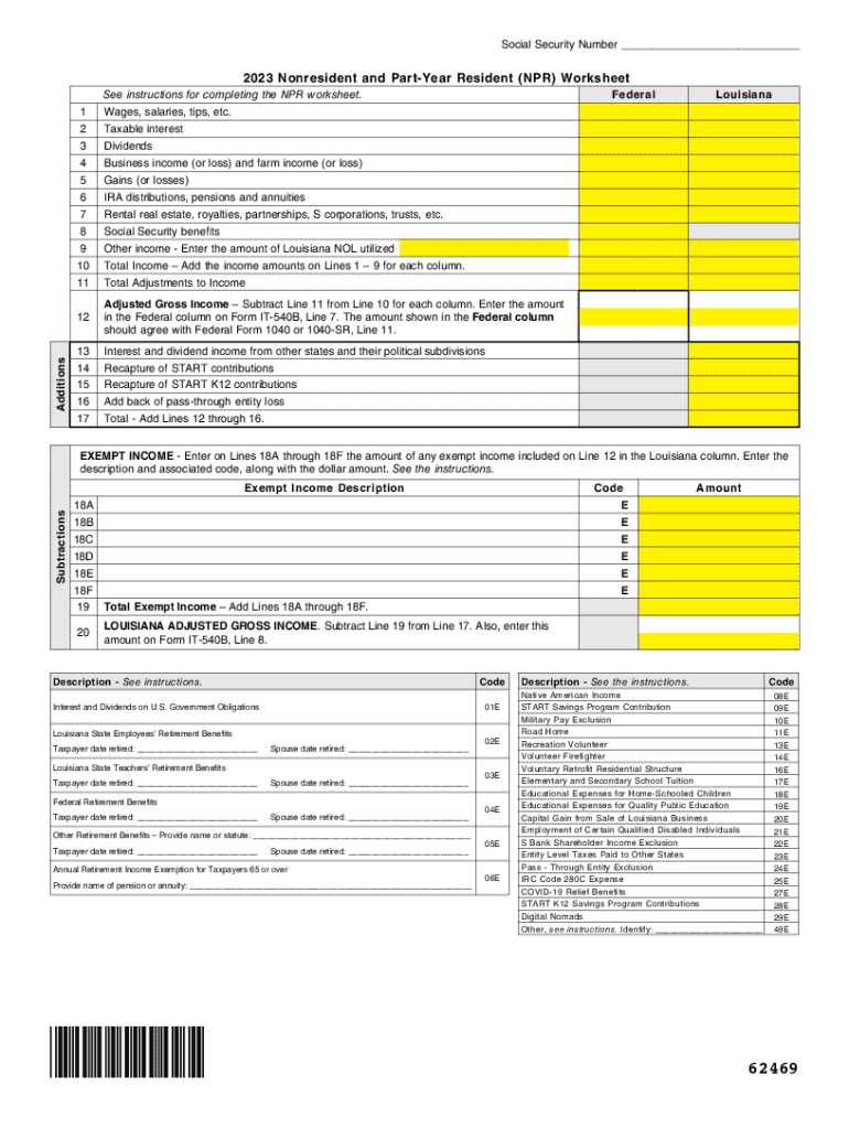 Social Security Number ___2023 Nonresident and PartYear Resident (NPR) WorksheetAdditions1 2 3 4 5 6 7 8 9 10 11FederalSee instructions for completing the NPR worksheet. Wages, salaries, tips, etc.
