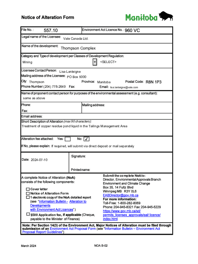 Manitoba Notice of Alteration Form File No.:Environment Act Licence No.:557.10Legal name of the Licensee: Name of the development:960 VCVale Canada Ltd.Thompson ComplexCategory and Type of development