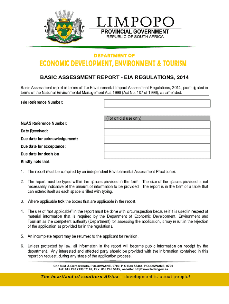 BASIC ASSESSMENT REPORT EIA REGULATIONS, 2014 Basic Assessment report in terms of the Environmental Impact Assessment Regulations, 2014, promulgated in terms of the National Environmental Management
