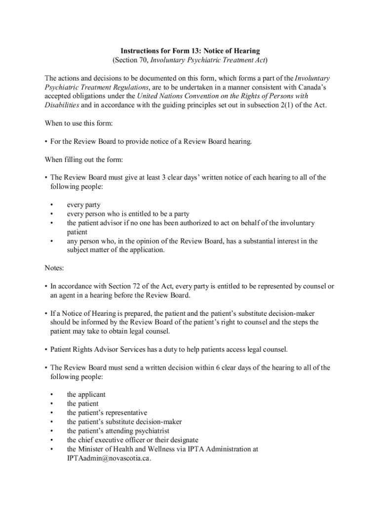 Instructions for Form 13: Notice of Hearing (Section 70, Involuntary Psychiatric Treatment Act) The actions and decisions to be documented on this form, which forms a part of the Involuntary Psychiatric