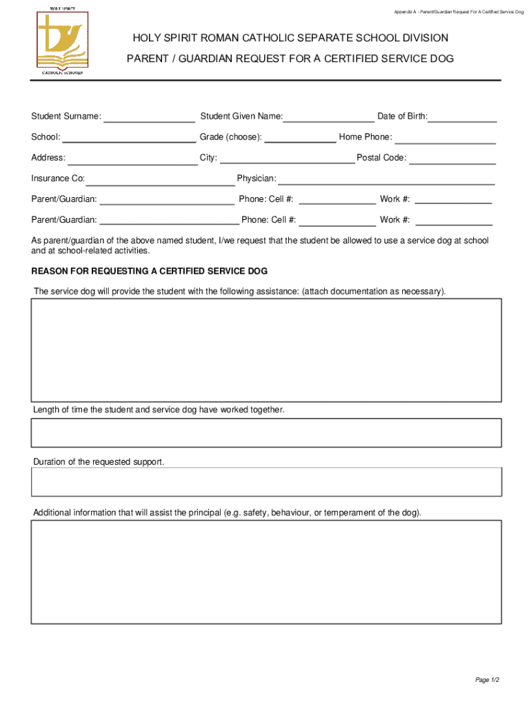 Appendix A Parent/Guardian Request For A Certified Service Highly SPIRIT ROMAN CATHOLIC SEPARATE SCHOOL DIVISION