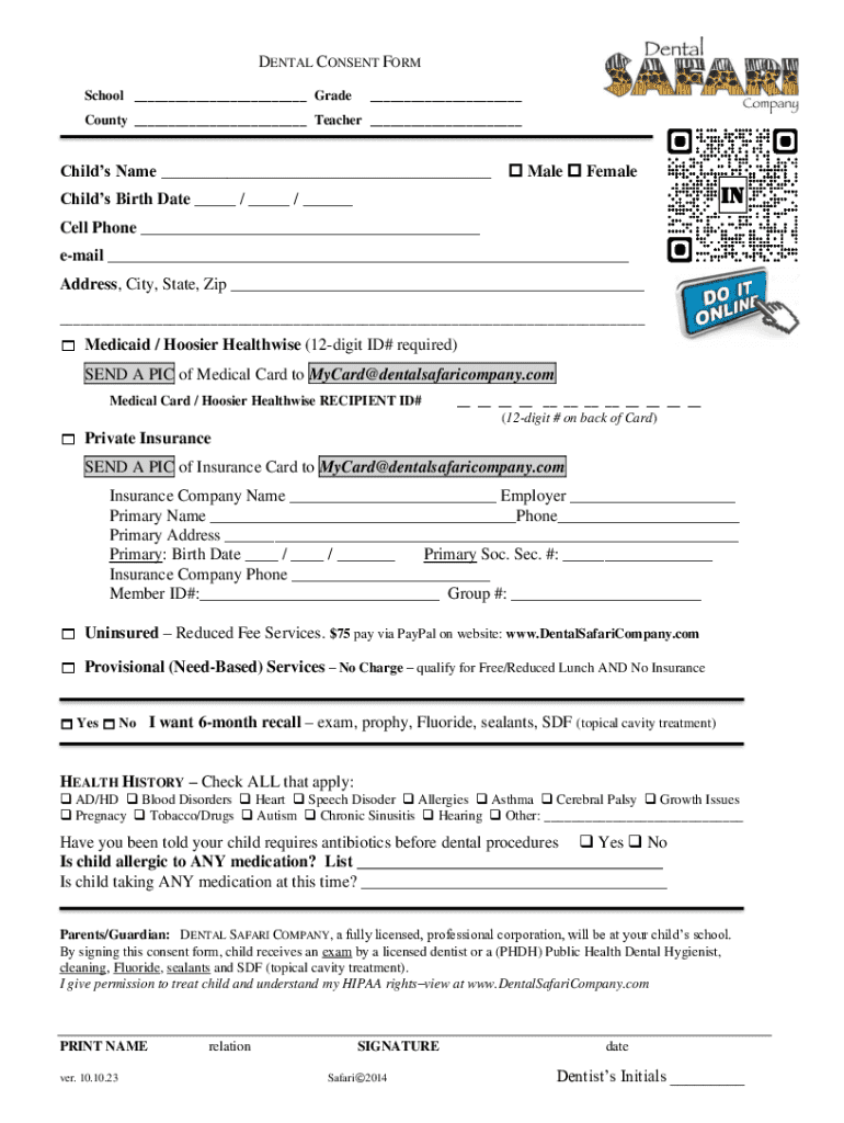 Complete the Dental Consent Form for your child\'s dental exam and treatments in school. Includes health history and insurance options.
