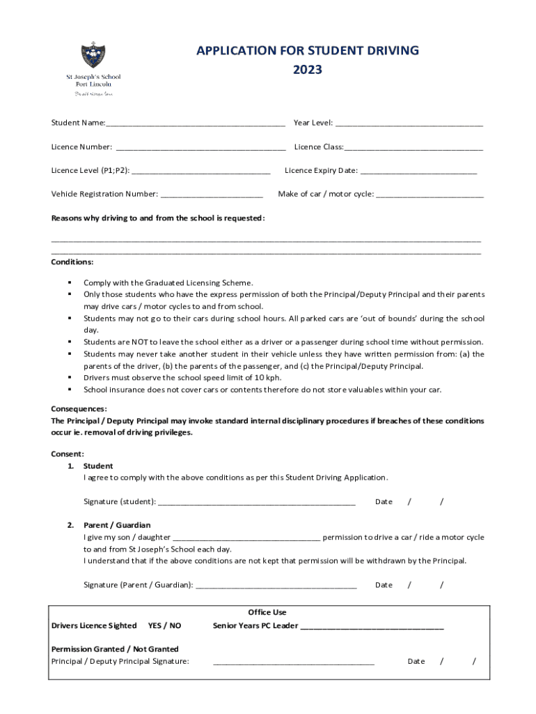 APPLICATION FOR STUDENT DRIVING 2023Student Name:___ Year Level: ___ Licence Number: ___ Licence Class:___ Licence Level (P1;P2): ___ Vehicle Registration Number: ___Licence Expiry Date: ___ Make