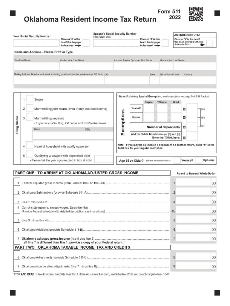 2022 Oklahoma Resident Individual Income Tax Forms and Instructions This packet contains: Instructions for completing the Oklahoma Resident Income Tax Return Form 511 Oklahoma Resident Income Tax