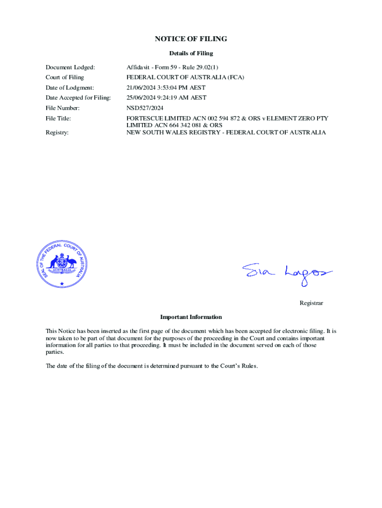This document details the filing of an affidavit in the Federal Court of Australia, involving parties Fortescue Limited and Element Zero Pty Limited, with significant information on the case.