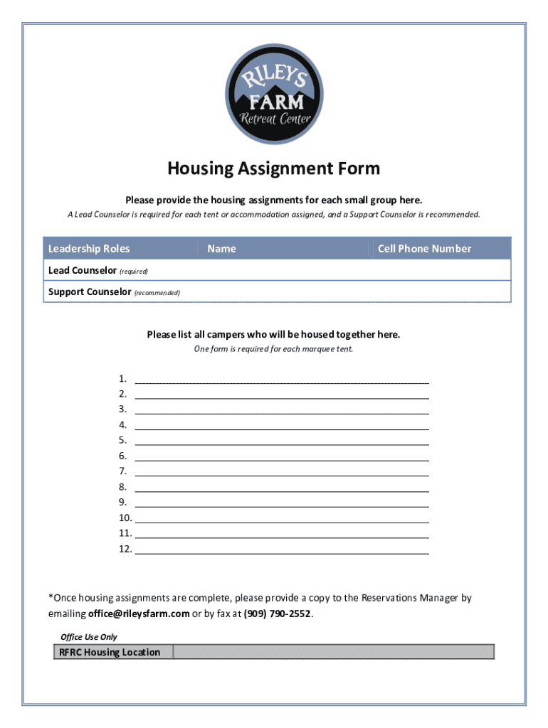 Housing Assignment Form Please provide the housing assignments for each small group here. A Lead Counselor is required for each tent or accommodation assigned, and a Support Counselor is recommended.Leadership