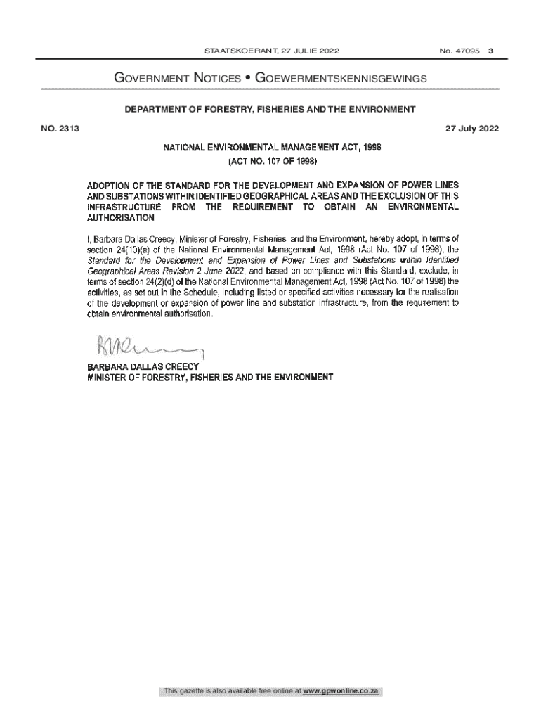 STAATSKOERANT, 27 Julie 2022No. 47095 3Government Notices Goewermentskennisgewings DEPARTMENT OF FORESTRY, FISHERIES AND THE ENVIRONMENT NO. 231327 July 2022NATIONAL ENVIRONMENTAL MANAGEMENT ACT,
