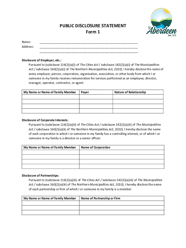 PUBLIC DISCLOSURE STATEMENT Form 1 Name: Address:___ ___ ___Disclosure of Employer, etc.: Pursuant to (subclause 116(2)(a)(i) of The Cities Act / subclause 142(2)(a)(i) of The Municipalities Act /