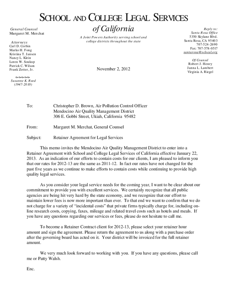 SCHOOL AND COLLEGE LEGAL SERVICES General Counsel Margaret M. Merchant Attorneys Carl D. Corbin Marko H. Long Kristina T. Jansen Nancy L. Klein Loren W. Souk up Patrick C. Wilson Frank Potter, Jr.