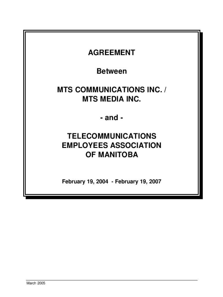 AGREEMENT Between MTS COMMUNICATIONS INC. / MTS MEDIA INC. and TELECOMMUNICATIONS EMPLOYEES ASSOCIATION OF MANITOBAFebruary 19, 2004 February 19, 2007March 2005INDEXGENERAL SECTION Article 1 Article