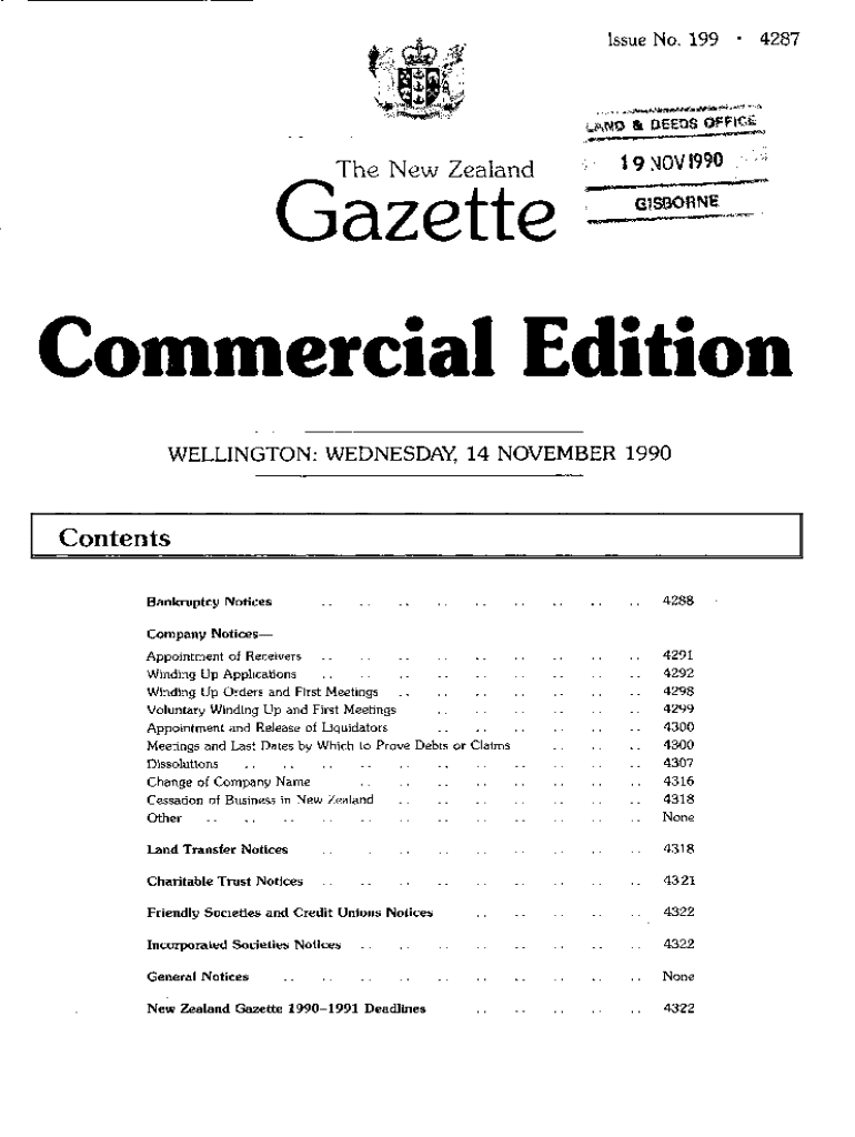 Issue No. 199 \" 4287slm & DEEDS OFFl l 19 ;40V 1990Gazette The New ZealandGISBORNECommercial Edition WELLINGTON : WEDNESDAY, 14 NOVEMBER 1990ContentsBankruptcy Notices... .. .....Company NoticesAppointment
